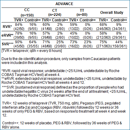 The Phase 3 ADVANCE study evaluated people who were new to treatment for hepatitis C. The retrospective analysis of IL28B status presented today includes people tested for IL28B genotype (454/1088; 42 percent). Of the patients in ADVANCE who were tested for their IL28B genotype, the distribution of the variations was consistent with previously published studies in people new to treatment. Data from the subanalysis of IL28B status in the control and telaprevir treatment arms (12 weeks) of the study are shown in the table.