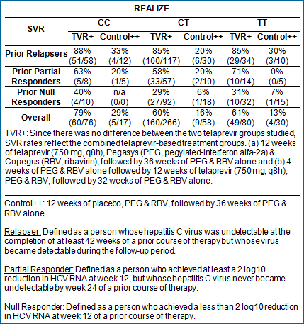The Phase 3 REALIZE study evaluated people whose prior treatment with pegylated interferon and ribavirin was unsuccessful (prior relapsers, prior partial responders and prior null responders). Of the patients in REALIZE who were tested for their IL28B genotype (527/662; 80 percent), the distribution of patients with the CT variation was over-represented and the distribution of those with the CC variation was under-represented. This is consistent with expectations for a population that has not responded to a prior course of treatment.