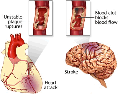 stroke). Blockage can occur when blood clots triggered by atherosclerosis